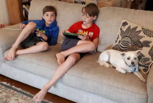 On Sunday, we moved Matilda off of her concrete slab, across the damp ground and up the driveway with no problems. We were off to visit Jamie and Denise at Woombye. Jamie was Katie’s colleague when they both worked at Hornsby Council. Jamie married Denise and moved to Woombye, and they have twin sons, Luke and Ryan. Their boys have grown up so fast–we saw them as babies when Jamie and Denise visited us a few years ago. they have also adopted an 8 year-old dog called Arnie (or Arnold when is not a good dog).