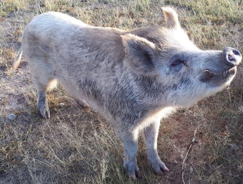 At Happy Hour, we learned about Bentley the pet pig. It had been raised on the farm from a piglet, and it was presumably very friendly despite being a razorback, or coming from feral stock. On Thursday morning, Ian took Dexter for a walk in search of Bentley. We found him in his own paddock, and indeed he was very friendly. Dexter was very keen to have a play. However, his tusks made him look rather fearsome, so Ian decided against giving him a pat.