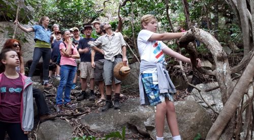 Plaque at start of the track to Cherry Tree BayBriefing at the start of our botanical bushwalk, with Darryn holding the straw hat and Tony pointing the way to go