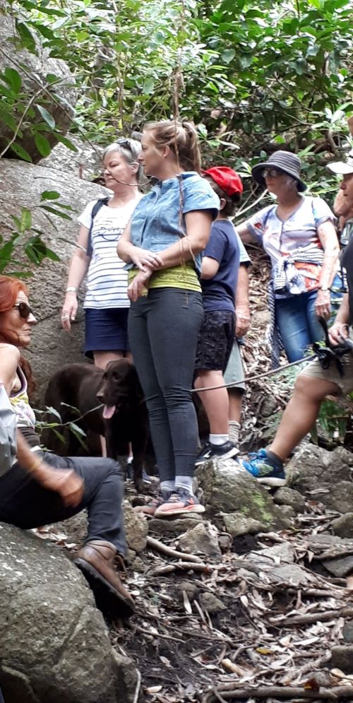 During the cruise, Darryn mentioned that he was also leading a botanically themed bushwalk the next morning. This was to start at Grassy Hill and finish in the Botanic Gardens. We met Tony Roberts, the curator of the Gardens, and asked him if we could take Dexter. Normally, dogs are not allowed in the conservation reserve, but he was prepared to turn a blind eye this time. It seemed that both Dexter and Sally were keen to go.
