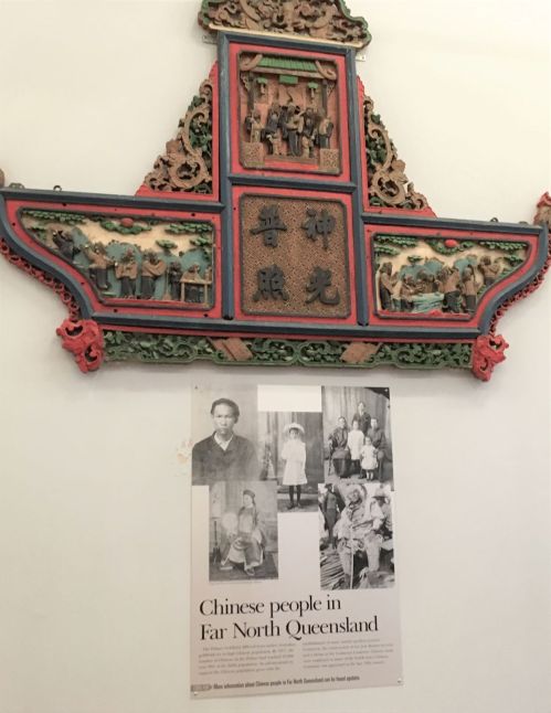 After a good night’s sleep, we felt a lot brighter on Thursday. We checked out the How Wang Chinese Temple, which was just 500 m away from the caravan park. For $10 we were given a guided tour of the temple and old Chinese village by Lucy, who is a retired local teacher. Dexter was made welcome by Lucy. The temple is the last remaining building of a Chinese village called Cedar Camp, which was the precursor of the town of Atherton. The temple was built in 1903. Most of the artefacts in the temple came from China. Most of the Chinese moved away in 1920, but the land was eventually bought by a group of Chinese families. In 1979, the land and building were donated to the National Trust of Queensland.