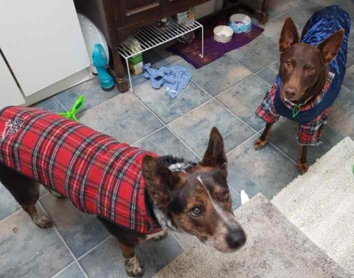 During our week at the Ramada, Kim updated us on Dexter. He was getting along well with the Red Kelpies, and Kim managed to get Dexter to accept wearing a coat. Later, Dexter also had a new doggie friend that looks like a Labrador cross. He made himself at home with Kim’s daughter, Grace.