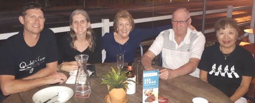 Grant, Jacqui, June, Ron and Katie after dinner. Katie Is wearing her Star Wars Meets Abbey Road T-shirt with four Stormtroopers using a pedestrian crossing.