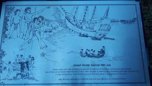 After our briefing, Darryn led the walk while Tony backed up the rear. Darryn told us that Joseph Banks funded a scientific team of 10, including a geologist. This was particularly interesting to Ian who is a retired geologist. As the plaque at the start of the track depicts, the English befriended the Aborigines whom they called “Indians”. We would learn the full story at the re-enactment the next day. We made lots of stops to look at interesting plants.