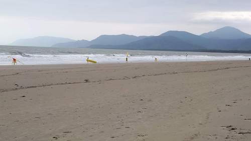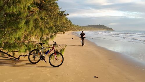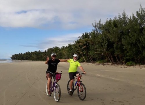 After having lazed around in Port Douglas for a week, Ian took the Trek mountain bike for a ride early on the last morning, Wednesday, north along the beach to wake up Grant. Grant was already up, so Grant and Jacqui grabbed bikes from their resort, and the three rode off and found coffee at The Little Larder. The coffee was good. They then rode south along the beach, and Grant and Jacqui accompanied Ian back to where Matilda was parked.