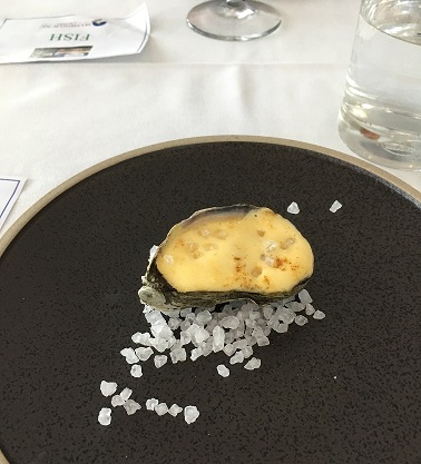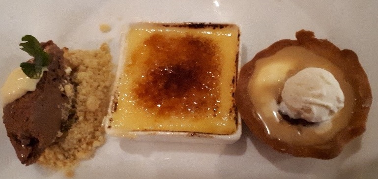 The dinner was delicious, and most guests purchased wine to accompany each course. Course One was Oyster Champagne Sabayon (a single oyster in its shell with a lovely sauce). Course Two was a choice of Scallop a la Provencale’s or Goat Cheese with Smoked Speck, Walnut and Croutons. Course Three was a choice of Barramundi, Olive Oil Potatoes, Asparagus, Capers, Lemon Parsley and Croutons, or Canard a l’Orange. Course Four was a trio of Crème Brulee, Banana Trifle and Chocolate Mousse.