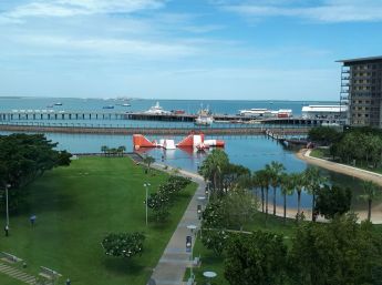 We had not booked any tours, but disembarkation was very smooth. We headed for the Big Red Bus and bought a $35 ticket each for the day. There are four double decker buses that travel a loop around Darwin, with 12 stops. Ticket holders can ride the bus and hop on and off as much as they like through the day. The top floor is open where the windows would be, and this allowed great ventilation when we were moving. The weather was warm and humid. Our first stop was at Cullen Bay, where we had a late breakfast at the Boatshed. Never had such a large bowl of muesli in my life! We originally planned to have lunch at Cullen Bay with Scott and Sally, but now we could have lunch elsewhere, possibly in the town centre.